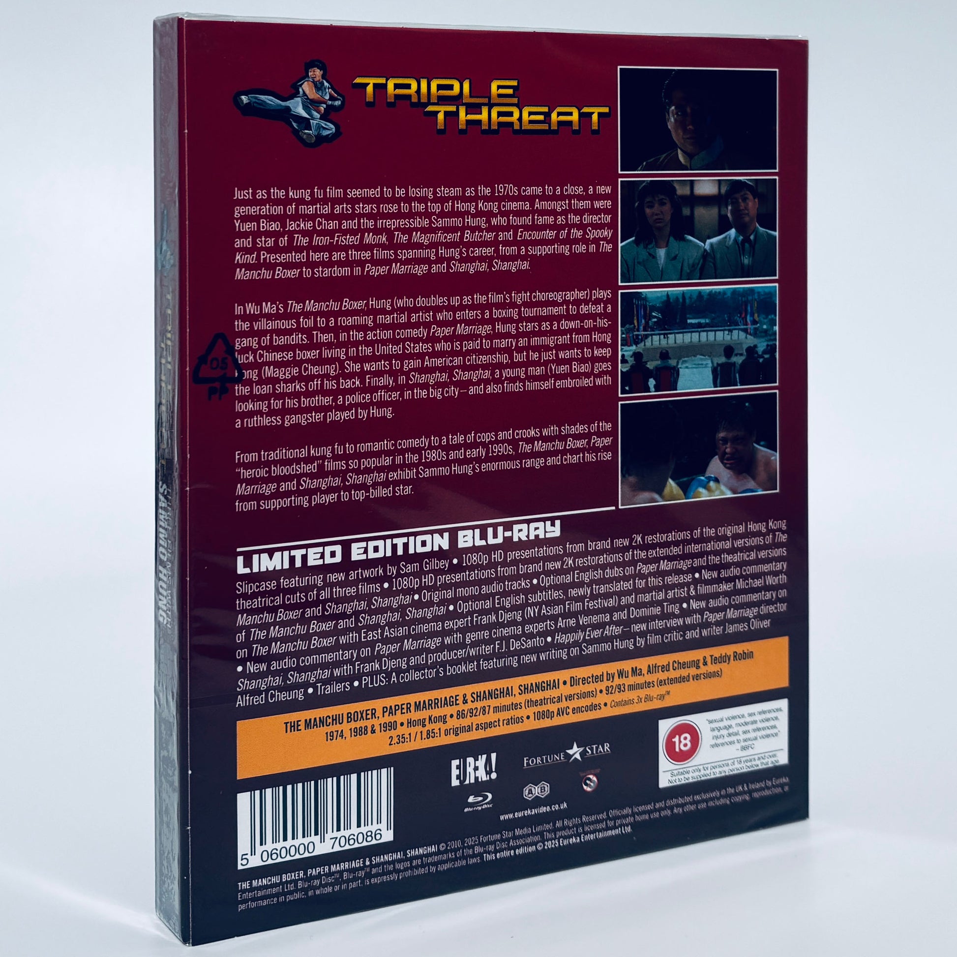 Introducing Eureka's Triple Threat:Three Films With Sammo Hung, a 3-Disc collectors set that includes 1974's The Manchu Boxer, 1988's Paper Marriage and 1990's Shanghai, Shanghai. Also included is a Bonus Disc exclusive to this set only - 1080p HD presentations from brand new 2K restorations of the extended international versions of The Manchu Boxer and Shanghai, Shanghai.